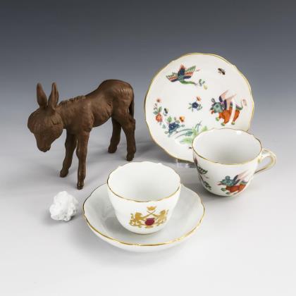 2x Mokkatassen in der Form "Neuer Ausschnitt": 1x mit dem Dekor "Fliegender Löwe" und 1x mit der Darstellung einer von zwei Löwen gehaltenen Vase (H Tassen 5 cm, Ø Untertassen 10,5 cm). / 1x kleiner Esel aus Böttgerporzellan, Modell-Nr. A 1247, Entwurf von Willi Münch-Khe (H 11,5 cm. / 1x kleiner Puttenkopf aus Biskuitporzellan (L 3 cm)