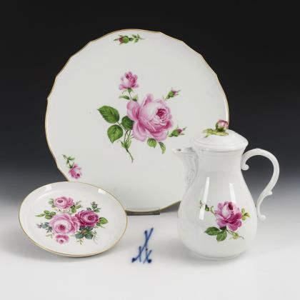 Tortenplatte, Kaffeekanne und Wandteller "Rote Rose". Meissen.