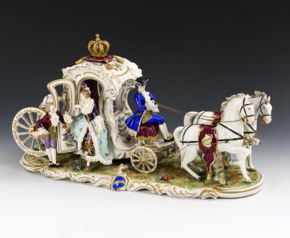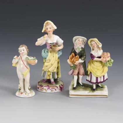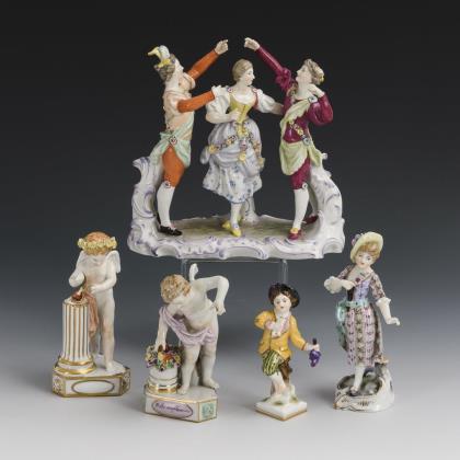 1x Tanzgruppe mit imitierter Ludwigsburgmarke: zwei auf einem Rocaillesockel mit einer jungen Dame tanzende Herren (H 19,5 cm). / 2 Devisenkinder Potschappel: 1x Amorknabe mit zwei Herzen und 1x Amorknabe mit Fackel und zwei Herzen in einem Rosenkorb (H 13,5 cm). / 1x Sternzeichenfigur "Krebs" KPM Berlin: Knabe mit Trauben, Kelch und Sternzeichentafel (H 12 cm). / 1x Passau: auf einem Rocaillesockel stehendes Mädchen mit Blumensträußchen