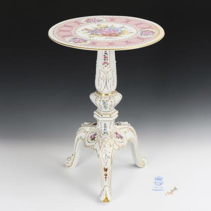 Runde Platte auf mehrfach gegliedertem Rocailleschaft mit dreibeinigem Fuß. Reiche Blumenmalerei, rosa Fondband auf der Tischplatte