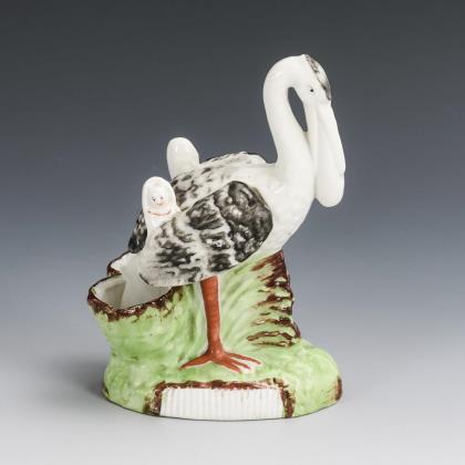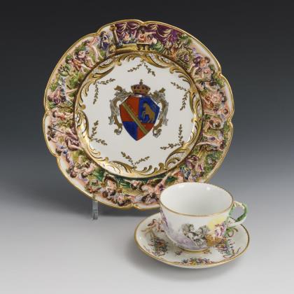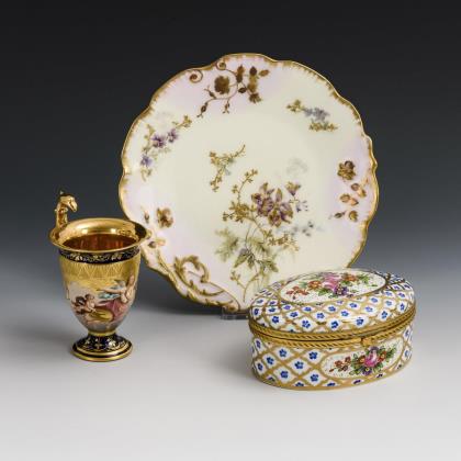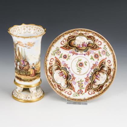 1x Helena Wolfsohn, um 1880: Untertasse mit Kauffahrteimalerei in drei Vierpasskartuschen (Ø 14,5 cm). / 1x unterseitig bezeichnet "Dec. 59 deposé": Vase mit vier Füßen auf Rundplinthe; umlaufend die Darstellung einer Landschaft mit Pferden, Reitern und Wanderern (H 14 cm)