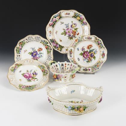 4 verschiedene Teller mit Blüten- bzw. Gitterdurchbruch und Blumenmalerei (Ø 1x 26 cm und 3x ca. 22,5 cm). 1 oval-vierpassiger Korb (L 24,5 cm) und 1 runder Korb (Ø 17,5 cm) mit Blütenbelag und Blumenmalerei