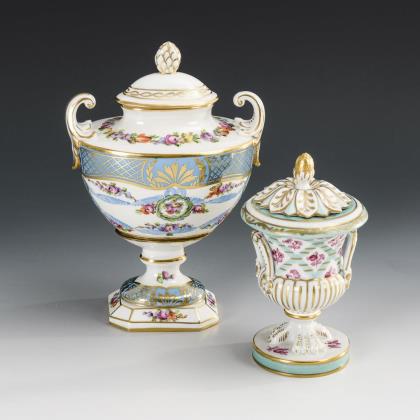1x halbovoid-ovaler Korpus mit zwei Handhaben, Knaufdeckel, Rundfuß und Rechteckplinthe: blauer, goldornamentierter Teilfond und Blumenmalerei. / 1x Kratervase mit blütenförmigem Knaufdeckel, dreiteiligem Tatzenfuß und Rundplinthe: türkisfarbener Teilfond und purpurfarbene Streublümchen