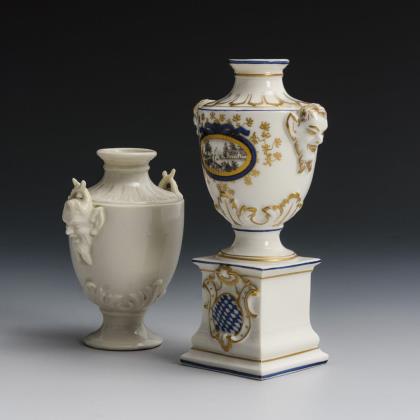 2 Maskaronvasen: 1x auf Postament mit dem Dekor "Bayerisches Königsservice", 1x weiß