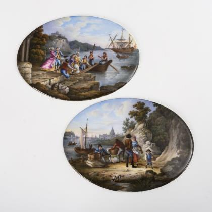 Ovale Platten: 1x mit der Darstellung einer figurenreichen Küstenszene mit Warenladungen, Bauern und einem Knaben; 1x mit der Darstellung einer Küstenszene mit zwei in ein Boot steigenden Rokokopaaren