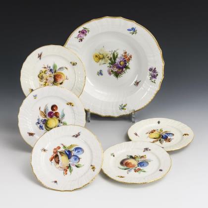 Form "Neuozier". 1x Royal Copenhagen, 1946: Suppenteller mit Blumenmalerei. / 5x KPM Berlin, Zeptermarke mit 2 Schleifstrichen, 1. H. 20. Jh., ohne Malermarke: Dessertteller mit Frucht- und Insektenmalerei