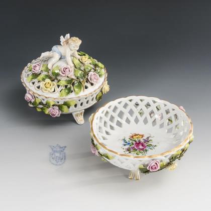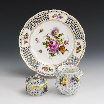 Druchbruchteller, -Dose und -Cachepot. Potschappel.