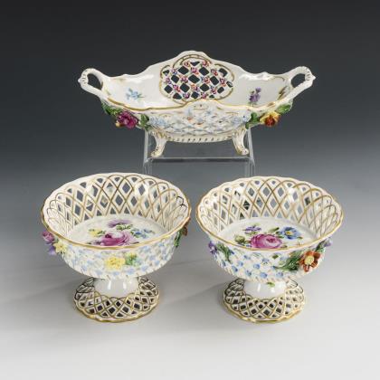 2 Fußschalen mit Korbdurchbruch, Vergißmeinnichtblüten und Blumenmalerei. / 1 Ovalschale mit Grillagedurchbruch, vier Füßen, zwei Handhaben und Blumenmalerei
