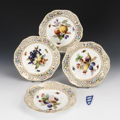 Mehrpassige Teller mit Blüten- und Grillagedurchbruch. Im Spiegel jeweils ein Fruchtbukett
