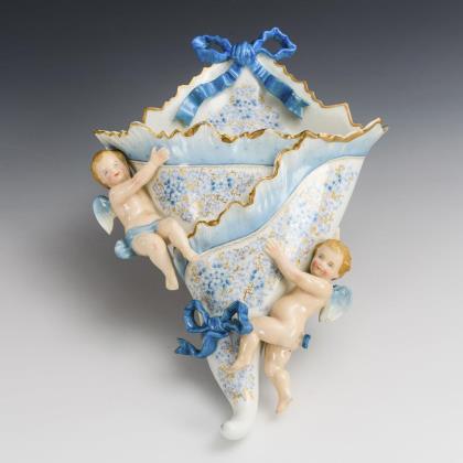 Zylinderform mit eingezogenem Stand und zwei gerollten Handhaben. Türkisblauer Fond, beidseitig eine große, goldgerahmte Kartusche mit der Darstellung von Puttenpaaren auf Wolken