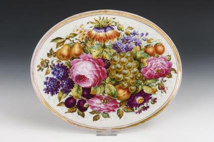 Ovale Platte mit leicht erhöhtem Rand. Bemalt mit einem leuchtend farbigen Blumen- und Fruchtbukett mit u.a. Rosen, Kaiserkrone, Flieder, Trauben, Birnen und Erdbeeren