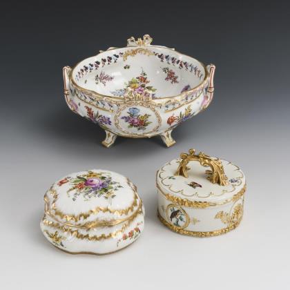 1x Nymphenburg: Ovalschale mit zwei Rocaillehandhaben (L 26,5 cm). / 5x Dresden: Kratervase mit Deckel (H 16,5cm), Maskaronvase mit Deckel (H 18 cm), 2 Ovalschälchen mit Blumenmalerei (L 9 cm) und 1 mehrpassiges Schälchen mit Kauffahrteimalerei (L 13,5 cm)