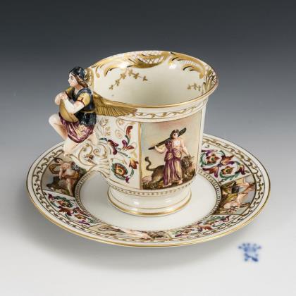 Untertasse und Vase mit Figurenmalerei.