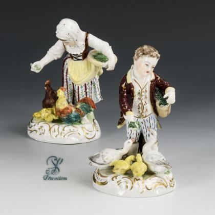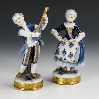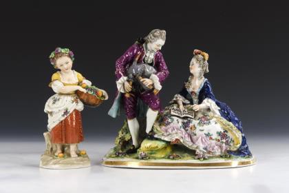 1x gemarkt Sitzendorf, 2. H. 20. Jh.: Gärtnermädchen mit Früchtekorb und Weinrebe im Haar (H 17 cm). / 1x Neapelmarke, Anfang 20. Jh.: musizierendes Rokokopaar eines Herren mit Dudelsack und einer Dame mit Notenheft (H 19,5 cm)