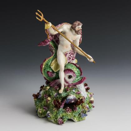 Auf einem wasserspeienden Delfin sitzender Neptun mit Dreizack, auf einen durchbrochen gearbeiteten Natursockel mit Muscheln und Korallen