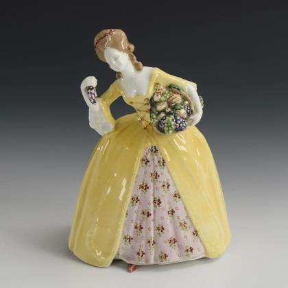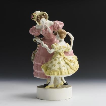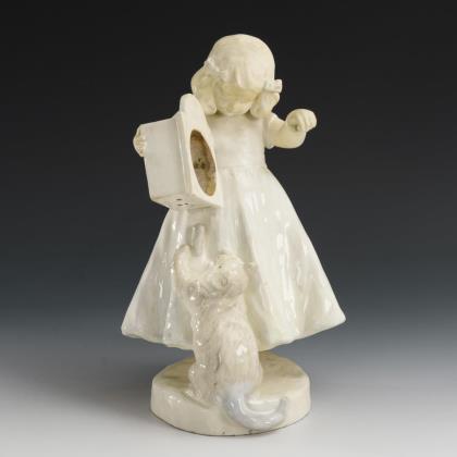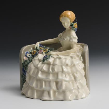 Jugendstil-Figur: Mädchen im Krinolinenkleid auf Bank. Gmundner Keramik.
