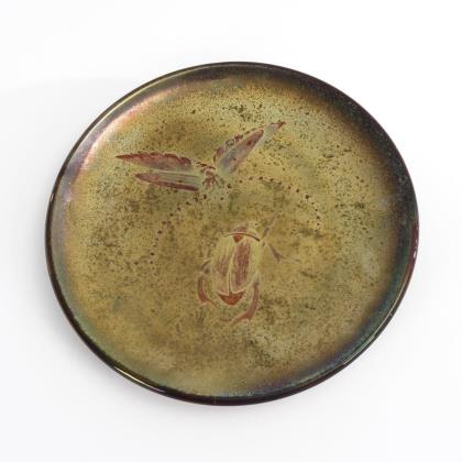 Runder Teller mit einem Käfer und einem Falter. Mit Aufhängung. Dazu runde Sockelplatte aus dunklem Holz (Ø 38 cm)