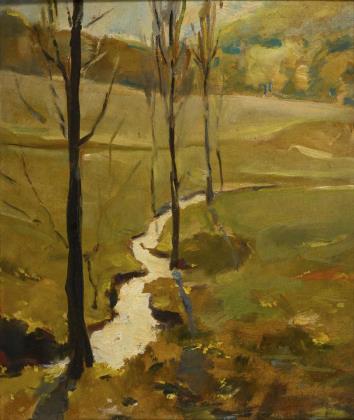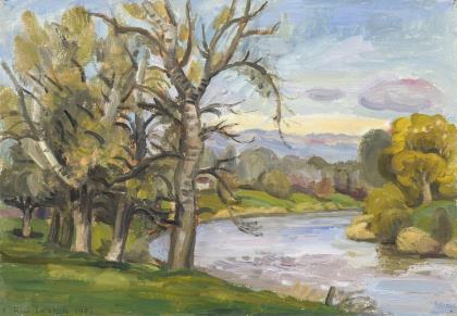 Impressionistisch gemalte lichte Niederung mit Frau am Fluss und Blick zum Dorf