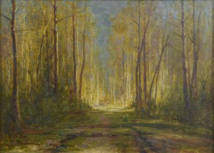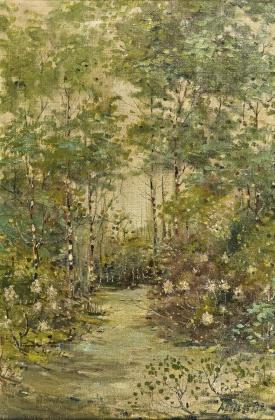 Undeutlich signiert: Lichte Waldlandschaft.