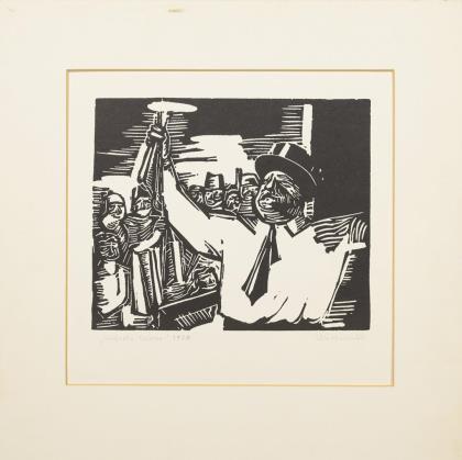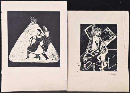 Tanzendes Paar in Tracht: Druckstock: 22 x 20 cm, Blatt: 35 x 25 cm, untere linke Ecke mit Knick, unterer Randbereich griffspurig | Mythologische Szene?: Druckstock: 18,5 x 14 cm, Blatt: 31,5 x 23,5 cm, Bleistiftsignatur "Adeler"?, rechter Rand stärker geknickt