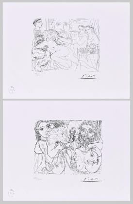 2 lithografische Abzüge nach den Radierungen aus "Suite Vollard": Blatt 84 - "Minotaure Caressant une Femme" (Exemplar: 476/1200) und Blatt 92 - "Minotaure, Buveur et Femmes" (Exemplar: 220/1200)