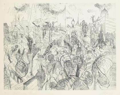 Vollständiges Mappenwerk mit 14 losen Farblithografien und Titel-Faltblatt mit Farblithografie, Vorwort, Biografie und Inhaltsverzeichnis, herausgegeben vom Kulturbund der DDR, in Original-Mappe mit Prägedruck; Mappendeckel mit Widmung in Tinte "für Ralf Storandt, der nicht an den Strand geht - vor Arbeitseifer ONH August 1983"