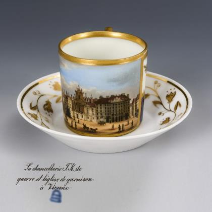 Zylindertasse mit gewinkeltem Henkel. Schauseitig eine goldgerahmte Rechteckkartusche mit der unterseitig in französisch bezeichneten Ansicht der Kaiserlich Königlichen Hofkriegskanzlei und der Garnisonskirche in Wien, verso kobaltblaues Fondband