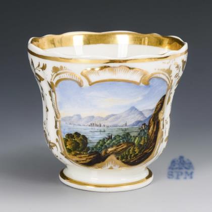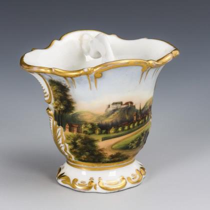 Gefußte, passige Glockentasse mit Ohrenhenkel. Schauseitig eine rocaillereliefgerahmte Kartusche mit der Ansicht des Rheins mit Burgruinen auf den Felsen, verso vegetabile Goldmalerei