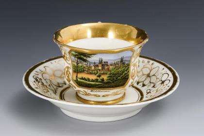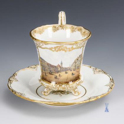 Zylindertasse mit Ohrenhenkel. Schauseitig eine goldgerahmte Rechteckkartusche mit der Ansicht eines Straßenzuges mit Obelisken, unterseitig bezeichnet "Che Obeliske", im Spiegel der Untertasse eine Stadtansicht mit der bezeichneten Ansicht von Derby mit Blick auf die Kirche