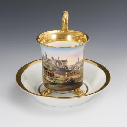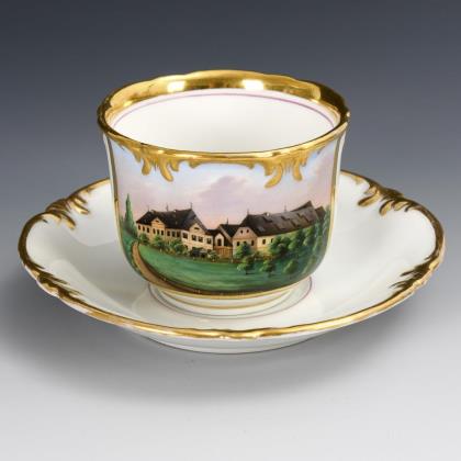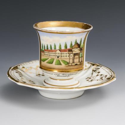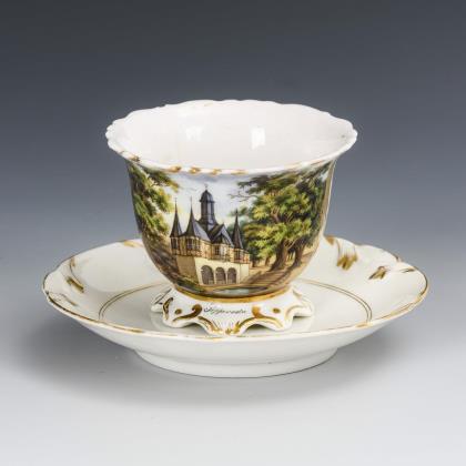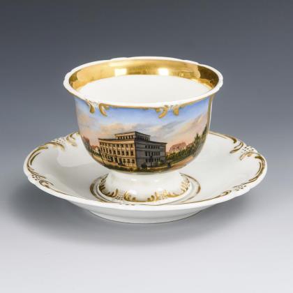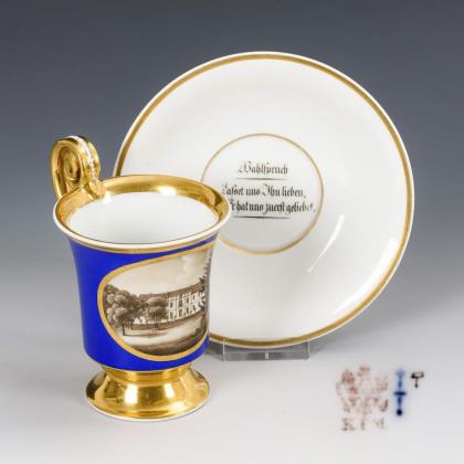 Gefußte Kratertasse mit Perlbandhenkel. Schauseitig ein Medaillon mit der sepiagemalten Ansicht eines Schlosses in einem Park, im Spiegel der Untertasse die Aufschrift "Wahlspruch / Lasset uns Ihn lieben, denn Er hat uns zuerst geliebt."