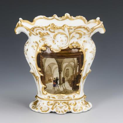 Geplattete Kratervase mit goldstaffiertem Rocaillerelief. Schauseitig die Interieurdarstellung der Kirche auf der Wartburg bei Eisenach
