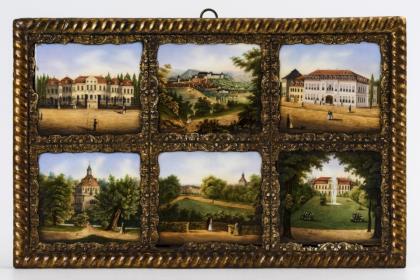 Sechs Porzellangemälde mit verschiedenen Ansichten von Gotha (u.a. Stadtansicht mit Schloss Friedenstein, Winterpalais, Teeschlösschen, Schloss Friedrichsthal). In einem goldbronzierten, ornamental verzierten Holzrahmen