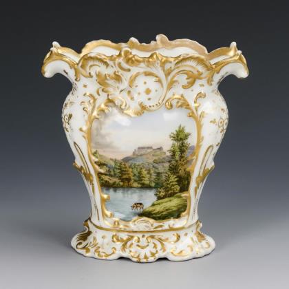 Geplattete Kratervase mit Rocaillerelief. Schauseitig eine Landschaftsansicht mit Blick auf die Wartburg bei Eisenach