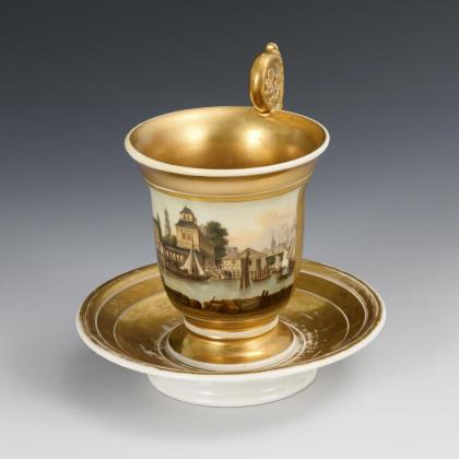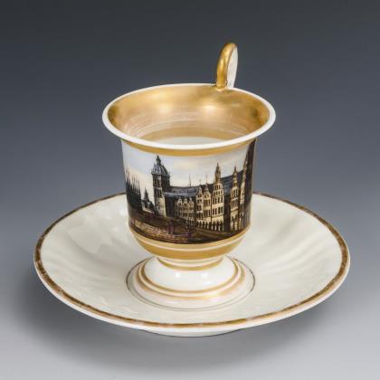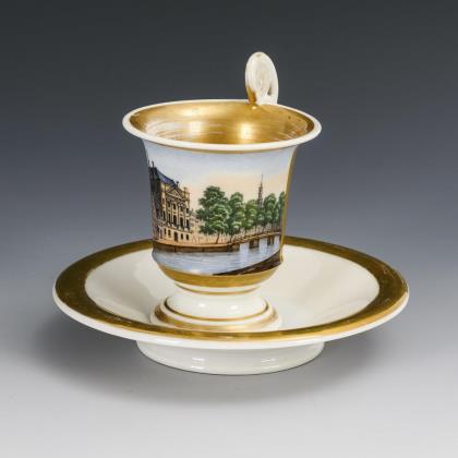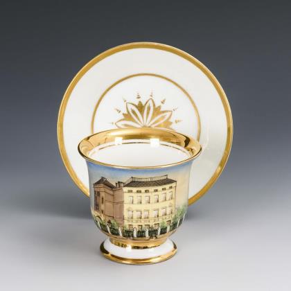 Gefußte Kratertasse mit Biskuit-Löwenkopfhenkel. Goldfond, schauseitig eine Rechteckkartusche mit der bezeichneten Ansicht des Hauses "Felix Meritis", das Sitz der gleichnamigen, 1777 gegründeten philanthropischen Gesellschaft war und sich im 19. Jahrhundert zu einem Zentrum von Kultur, Wissenschaft und Technik entwickelte