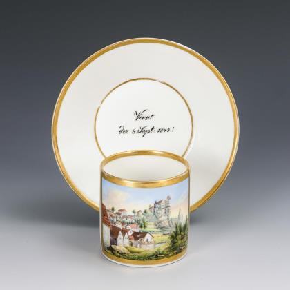 Zylindertasse mit Ohrenhenkel. Schauseitig eine goldgerahmte Rechteckkartusche mit der Ansicht der oberfränkischen Stadt Egloffstein in der Fränkischen Schweiz. Im Spiegel der Untertasse die Widmung "Vivat der 8. Sept. 1848!"