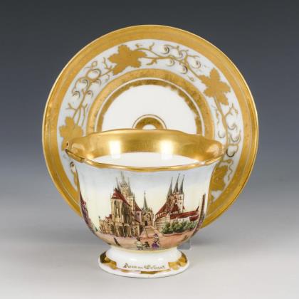 Gefußte Glockentasse mit Rocaillehenkel. Schauseitig eine goldgerahmte Rechteckkartusche mit der Ansicht von Dom und Severikirche in Erfurt