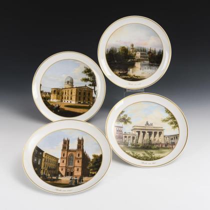 3 Teller mit Ansichten nach dem Maler Carl Daniel Freydank (1811-1887): Die Heilandskirche in Satrow 1843, die Sternwarte 1838 und die Werdersche Kirche 1838; alle verso bezeichnet. / 1 Teller mit der Darstellung des Brandenburger Tores, verso bezeichnet "3. Oktober 1990 Tag der deutschen Einheit"