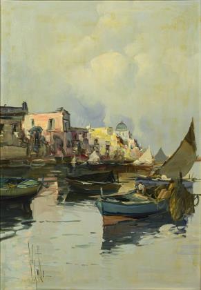 CARELLI, Giuseppe (1858 Neapel - 1921 Rom). Fischerboote vor Schloss und Vesuv.