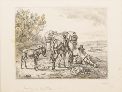 "Der Hühnerhund am Röhrenbrunnen": Platte: 11,3 x 14,5 cm, Blatt: 16,3 x 20 cm, auf grauen Karton montiert: 25 x 35 cm, etwas stockfleckig | Kopfstudie eines Rindes: Platte: 11 x 15,5 cm, Blatt: 24 x 33,5 cm, im Passepartout: 30 x 43 cm, etwas stockfleckig | Heuwagen mit Pferdegespann: Platte: 18,3 x 25 cm, Blatt: 23 x 30 cm, auf Karton montiert: 31,5 x 44,5 cm, stärker stockfleckig | Liegendes Pferd: Platte: 11,3 x 18 cm, Blatt: 22 x 29 cm, verschmutzt und stockfleckig | "À Napoli": Platte: 13,5 x 20,5 cm, Blatt: 24,5x 33,5 cm, Blindstempel "Radier Club München", stark stockfleckig | "Eseltreiber mit Esel und Füllen": Platte: 20 x 25,5 cm, Blatt: 25 x 33 cm, im Passepartout: 35 x 47 cm, etwas stockfleckig
