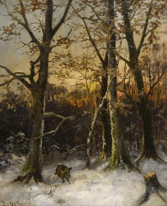 GOGARTEN, Heinrich (1850 Linz am Rhein - 1911 München). Wildschwein im Winterwald.