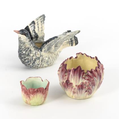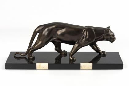 Jugendstil-Uhr als Einzelanfertigung nach einem Entwurf von Otto Pilz, in Form eines Natursockels, in dem sich ein Hase versteckt. Bekrönende Fuchsplastik in lauernder Jagdhaltung