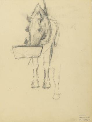 Studie eines Pferdes in Vorderansicht mit Kummet und Tränke