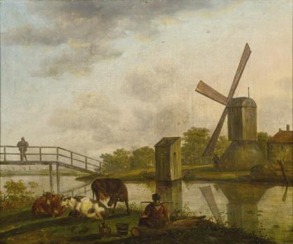 Dorflandschaft mit Windmühle sowie Personen mit dem Vieh nahe dem Flussufer