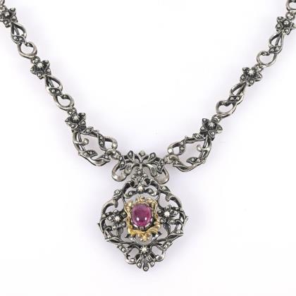 An reliefierter Ziergliederkette großer Ornament-Anhänger mit krappengefasstem, rosafarbenem Turmalin?, vergoldeter Mittelkartusche und kleinen Halbperlchen. Kastenschloss mit Achtersicherung