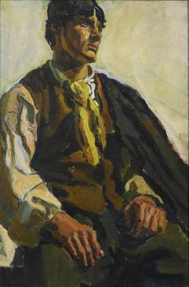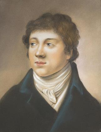 Brustbildnis eines jungen Mannes in typischer Kleidung, um den Hals einen langen Seidenschal mehrfach eng gebunden, mit einem Knoten zugeschnürt. Rückseitig alter Pariser Klebezettel. Verglaster vergoldeter Stuckrahmen