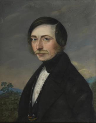 Bildnis eines Mannes im schwarzen Gehrock mit weißem Hemd vor weiter bergiger Landschaft