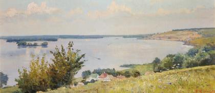 Detailliert ausgeführte, überlegt komponierte Sommerlandschaft in hellem Kolorit. Die große Wasserfläche ist reizvoll zergliedert. Rückseitig kyrillisch bezeichnet. Profilierter Rahmen mit Goldleiste und Leinenbezug