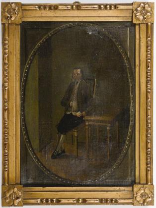 In oval gemaltem Passepartout ausgeführtes ganzfiguriges Bildnis eines Mannes auf einem Stuhl