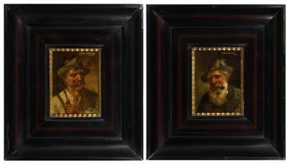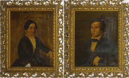 Zwei Biedermeierporträts in dekorativen Rahmen.