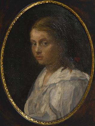 Brustbildnis mit jugendlich-weiblichem Liebreiz, der anmutige Kopf mit sentimentalem Blick. Geschwärzter Profilrahmen mit rotbrauner Furnier-Optik